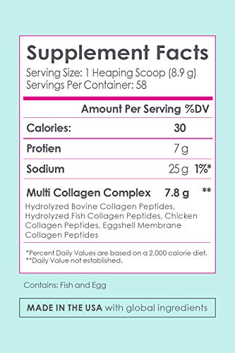 150/2000 calories remaining. Collagen is the most abundant protein in the body and ensures healthy and vibrant hair, skin, nails and tendons. 1 scoop (8.2 g) per container:
